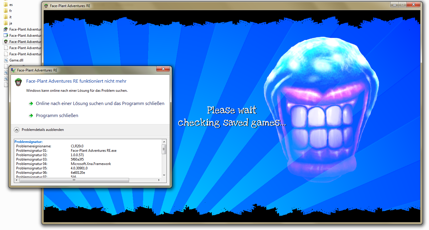 But I kept searching the interwebs and read many not very helpful forum threads until I finally stumbled upon an entry in the Steam forums that sounded a lot like the issue I was dealing with. It turned out that several other XNA games would also crash after startup or have audio issues when the Windows Media Player was not installed on a user's machine. To verify this I uninstalled the player on my machine and then was able to reproduce the crash. After checking and creating/loading the save file, the game starts playing back music and with Windows Media Player not available this would cause the crash. I was not aware of this dependency and wouldn't know how to avoid it, but at least I can include this information in the game's readme file now. And now that my remaining two testers can finally check out the game, I will just wait for their feedback before I will finally get the game ready for release.